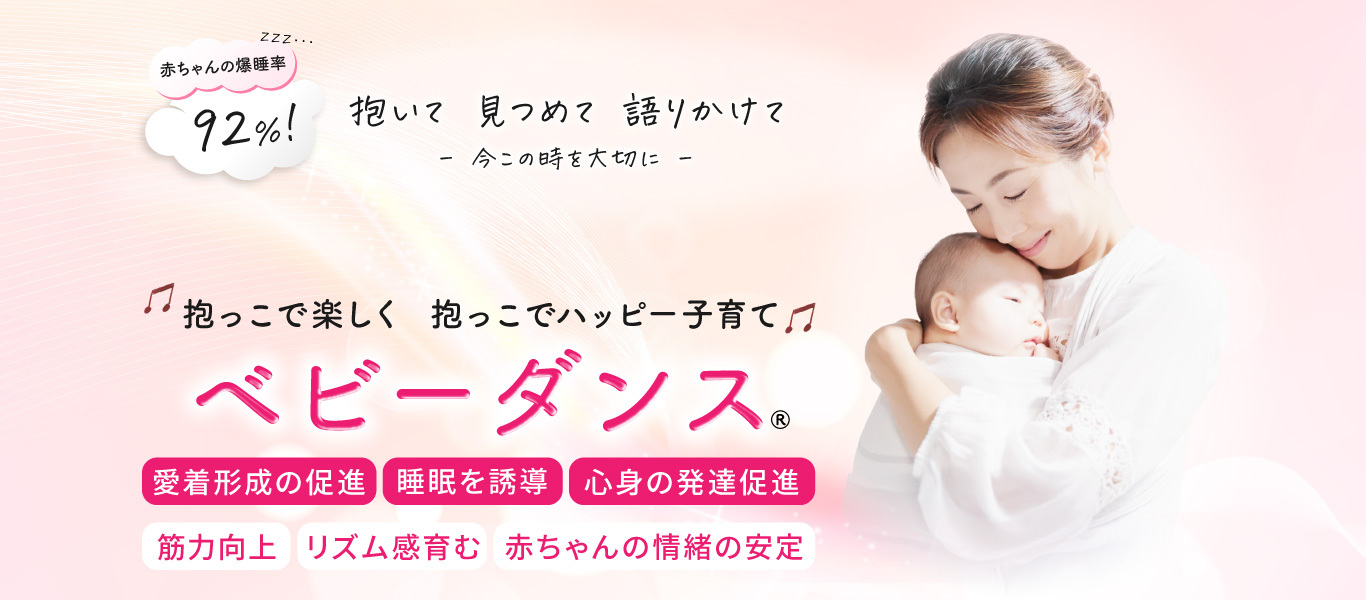 ベビーダンスってなんだろう?ぐずっていた赤ちゃんが、にっこり! そしてスヤスヤ!赤ちゃんの爆睡率92%!(本協会調べ)赤ちゃんを抱っこしながらリズムに合わせて踊るエクササイズです。詳しくはコチラをクリック! レッスンに参加するには「抱っこってこんなに楽だったの?!」と実感できるベビーダンスのレッスン!普段使っている抱っこ紐で、気軽に参加できます。詳しくはコチラをクリック! インストラクターになるには子育てやダンス等の経験を活かし、赤ちゃんと一緒に活動できる! ベビーダンスインストラクターになるための養成講座はオンラインで学べます。詳しくはコチラをクリック!